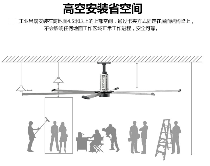 9、節約空(kong)間(jian),懸掛在屋面(mian)結構梁上,安全可靠,不會(hui)阻礙任(ren)何(he)地面(mian)工作空(kong)間(jian)。